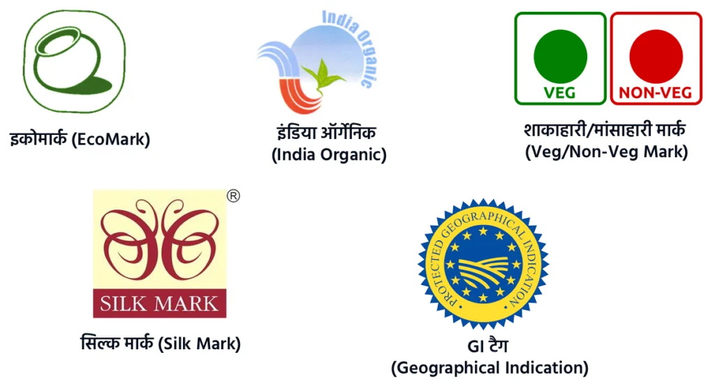 | इकोमार्क (EcoMark) | स्वैच्छिक (Voluntary) | पर्यावरण के अनुकूल (Eco-friendly) उत्पाद |